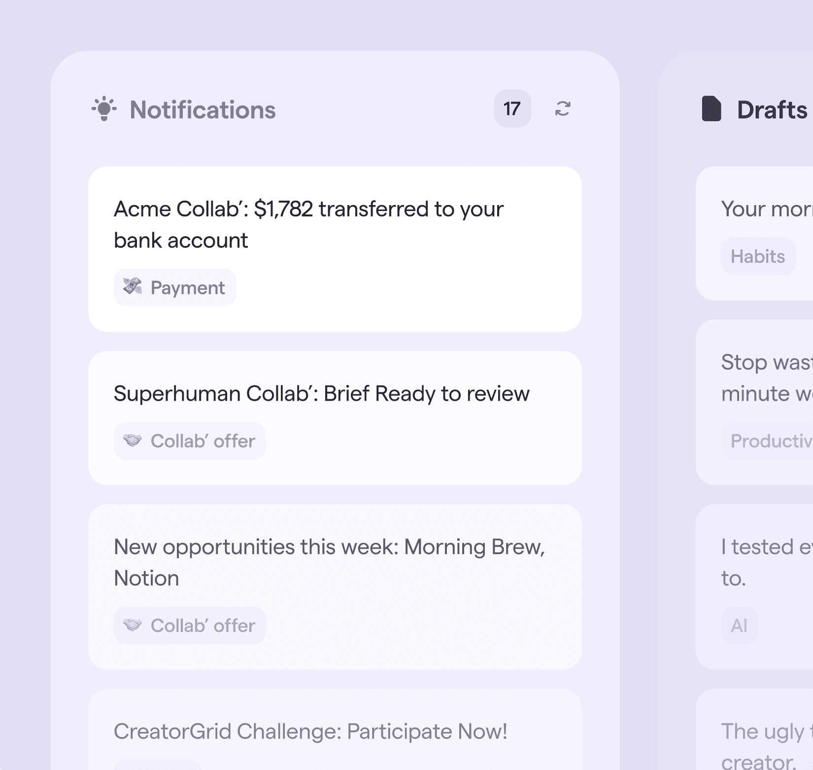 We take care of all the heavy lifting -from coordinating with the brand, sharing briefs, arranging payments and invoices, and more- so you can spend more of your time creating.